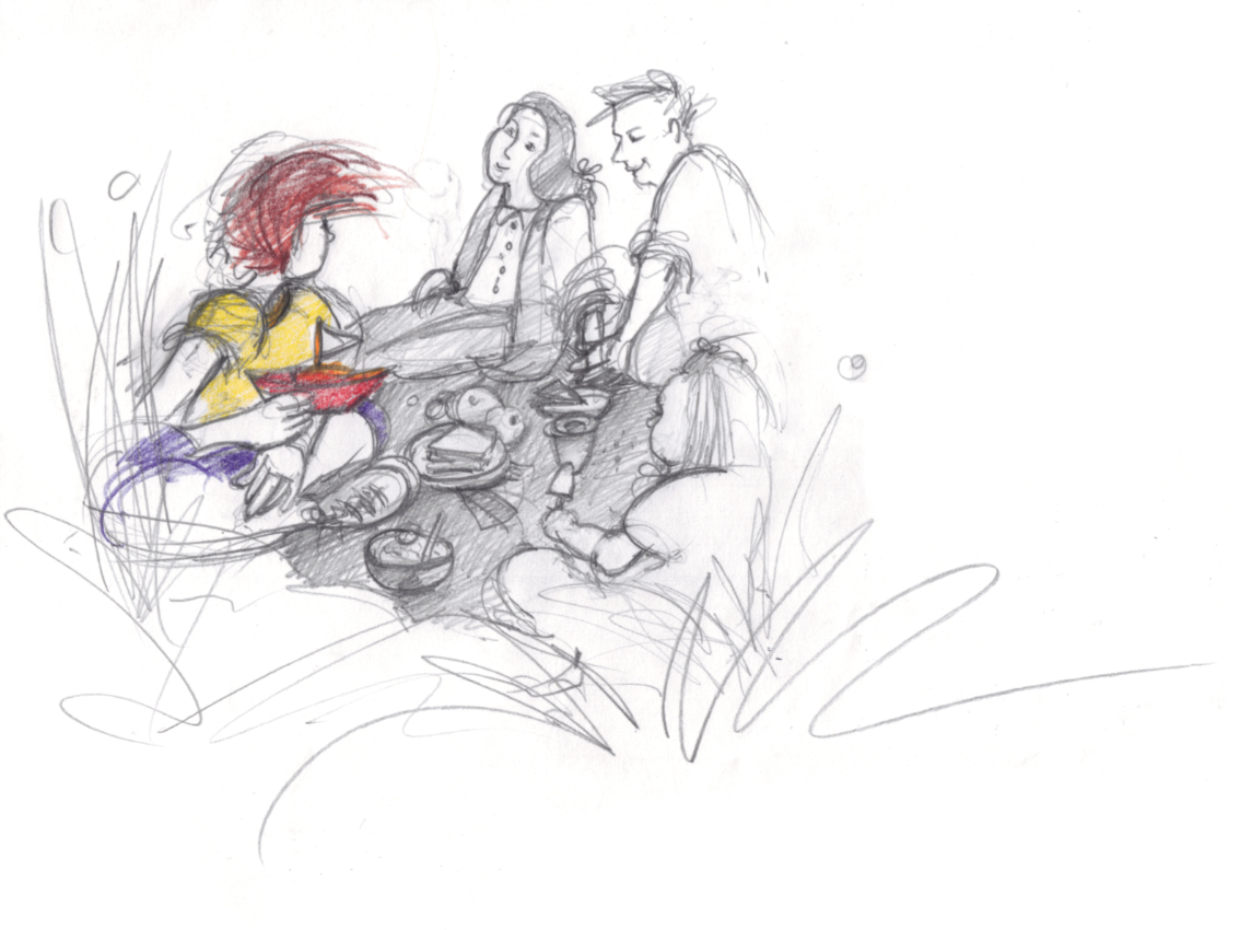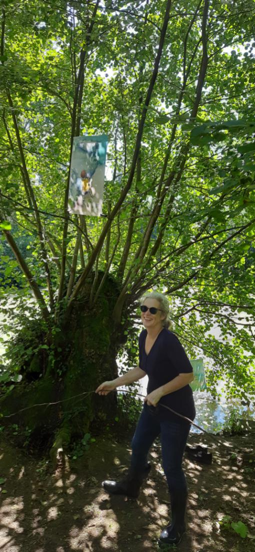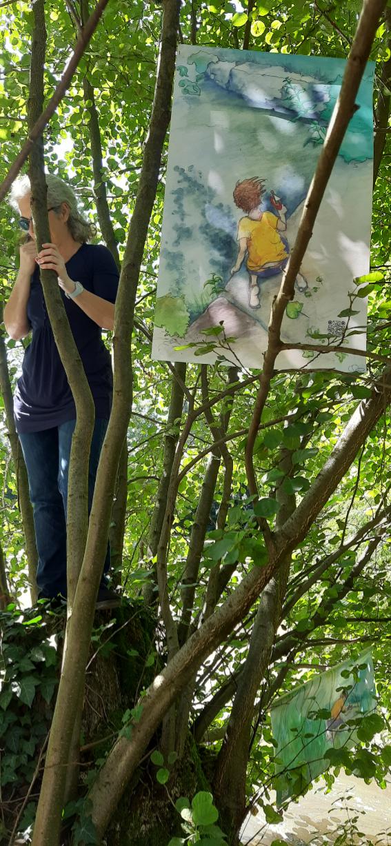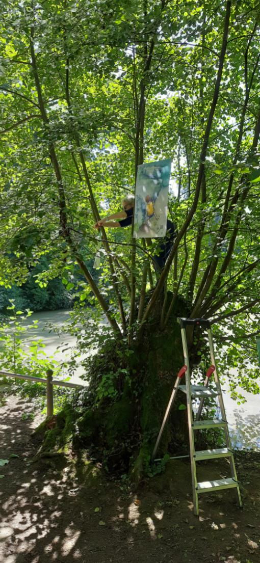 Dies kann als die Fortsetzung meiner Ausstellung „Augenblicke … das Unischtbare sichtbar machen“ (Ausstellung hier im Park September 2022), gesehen werden, bei der ich die Augen der Tiere des Parkes darstellte, die uns sehen, wir aber nicht immer sie. Jetzt geht es um das, was oder wenn sie sehen, um ihre Sichtweise auf denselben Moment aus verschiedenen Blickwinkel (Moment mal!, Moment mal vier) und unsere Sicht. Eine Szene im Park: Eine Familie macht ein Picknick auf der Wiese. Der kleine Sohn rennt mit seinem Spielzeugboot an den Teich und möchte es schwimmen lassen. Der Moment: Der Junge hält das Boot über das Wasser um es gleich ins Wasser zu lassen. Die Perspektiven: 1. Die Heuschrecke sieht durch Gräser den Jungen von weitem, wie er das Boot ins Wasser läßt. 2. Der Papagei* auf seinem Platz im Baum sieht den Jungen von oben. 3. Der Fisch im Teich sieht das Boot von unten, wie es gerade ins Wasser gelassen wird. 4. Kurgast/Parkbesucherin sehen den Jungen aus unserer menschl. Perpektive am Rand des Teiches knien.